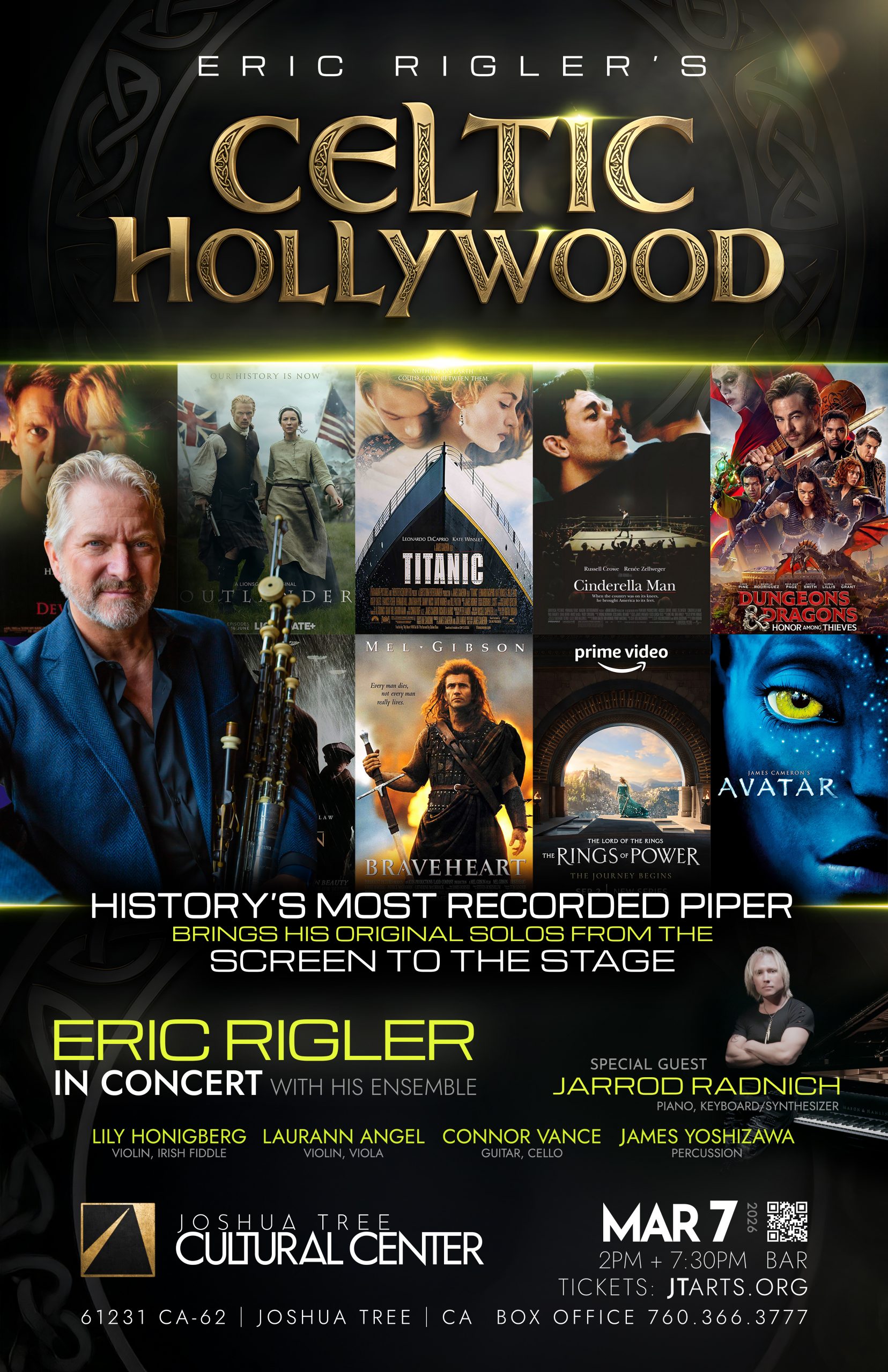 With Eric Rigler, history’s most recorded Celtic musician, performing his original melodies from Oscar-winning films, hit TV shows, and Grammy-winning albums featuring Special Guest Jarrod Radnich on the piano, plus an ensemble of virtuosic musicians.