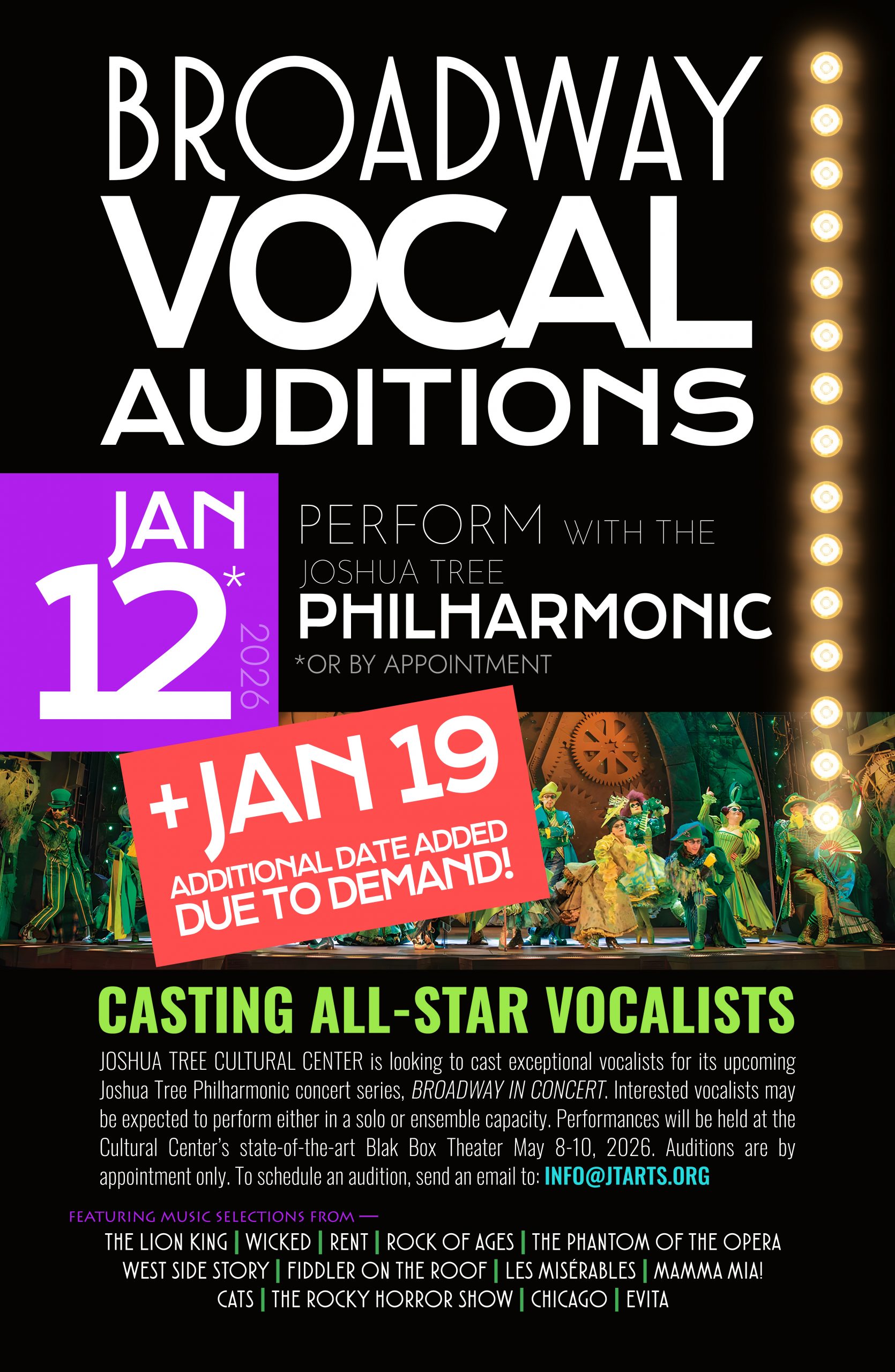 JOSHUA TREE CULTURAL CENTER is looking to cast exceptional vocalists for its upcoming Joshua Tree Philharmonic concert series, BROADWAY IN CONCERT. Interested vocalists may be expected to perform either in a solo or ensemble capacity. Performances will be held at the Cultural Center’s state-of-the-art Blak Box Theater May 8-10, 2026. Auditions are by appointment only. To schedule an audition, send an email to: INFO@JTARTS.ORG or call 760.366.3777