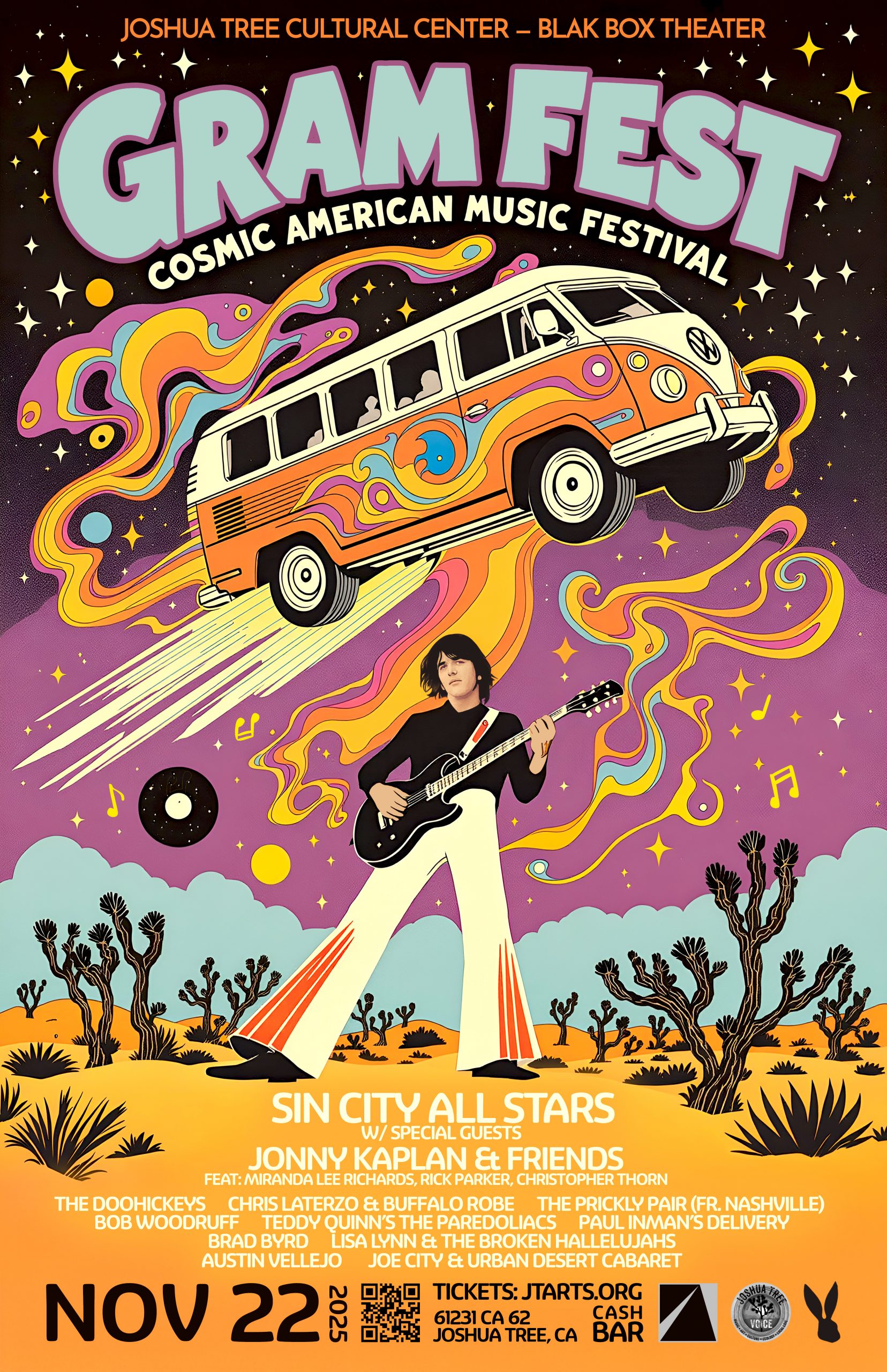 The spirit of Cosmic American Music returns to the Joshua Tree desert this fall with the revival of GramFest: A Cosmic American Music Festival, taking place Saturday, November 22, 2025, from 3:00 PM to 10:30 PM at the Joshua Tree Cultural Center’s Blak Box Theater (formerly the Hi-Desert Cultural Center).